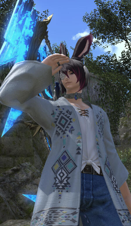 A soft-spoken man known to wander hither and thither, often heard before seen due to his habit of humming to himself. He might seem distant at first glance, but there is an oddly approachable air about him, despite how he lingers away from the crowds. On a nice day, one may come across him napping in a high place, preferably a sturdy bough.His instinctive wanderlust means he rarely stays in one place too long at a time, though he seems most inclined to return to Gridania when he tires of traveling. If asked why, he would be quick to point out his heritage and resultant upbringing: the woods are just what's most familiar.